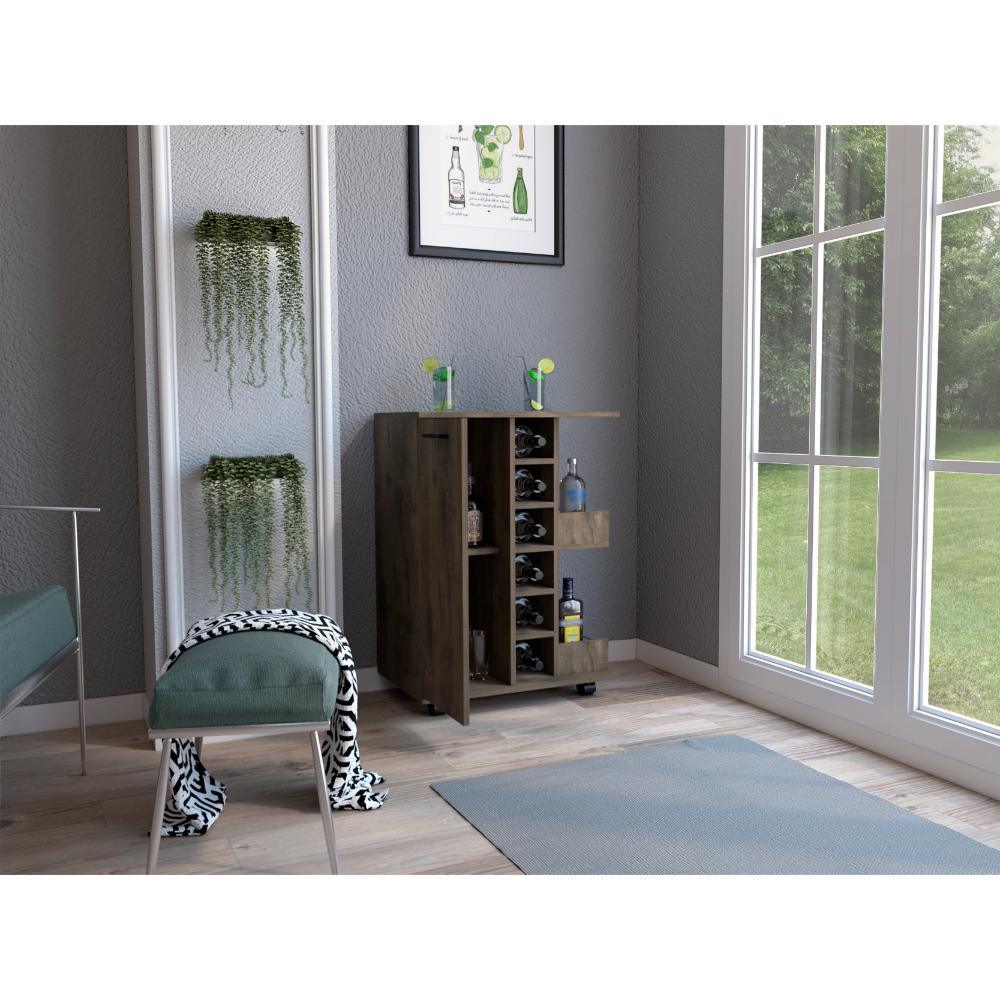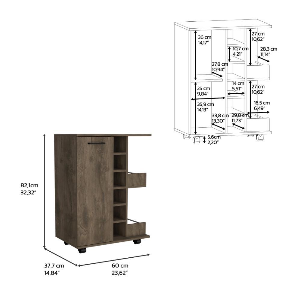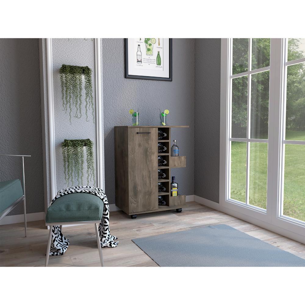 Bar bajo con una puerta abatible, espacio para ubicar licores, rodachinas para su fácil desplazamiento