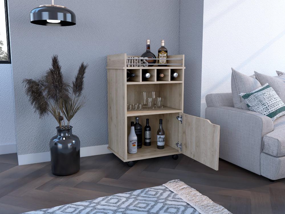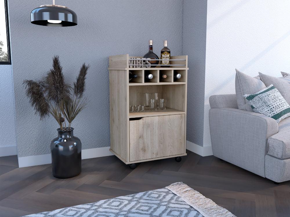 Bar, con espacio para organizar licores y vasos, rodachinas para fácil desplazamiento, fácil armado e instalación.