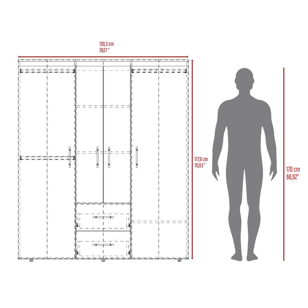 Closet, con cuatro puertas batientes, dos cajones, tres tubos pata colgar ropa y amplios espacios de guardado.