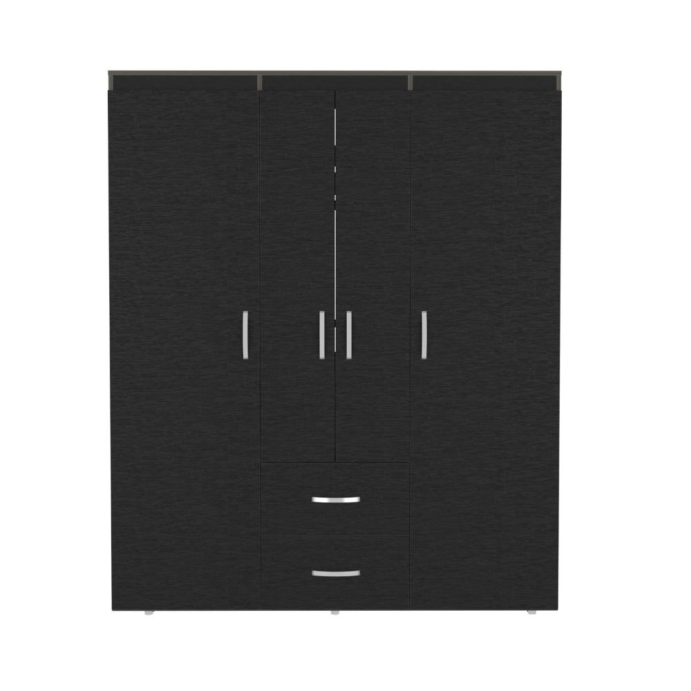 Closet, con 4 puertas batientes, 2 cajones deslizables, 3 tubos pata colgar ropa y amplios espacios de guardado.