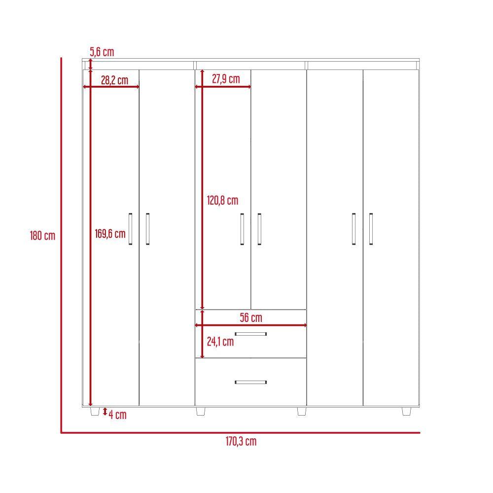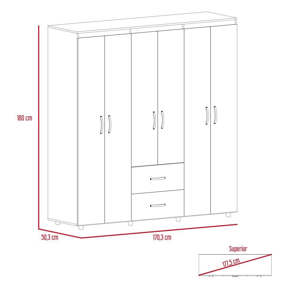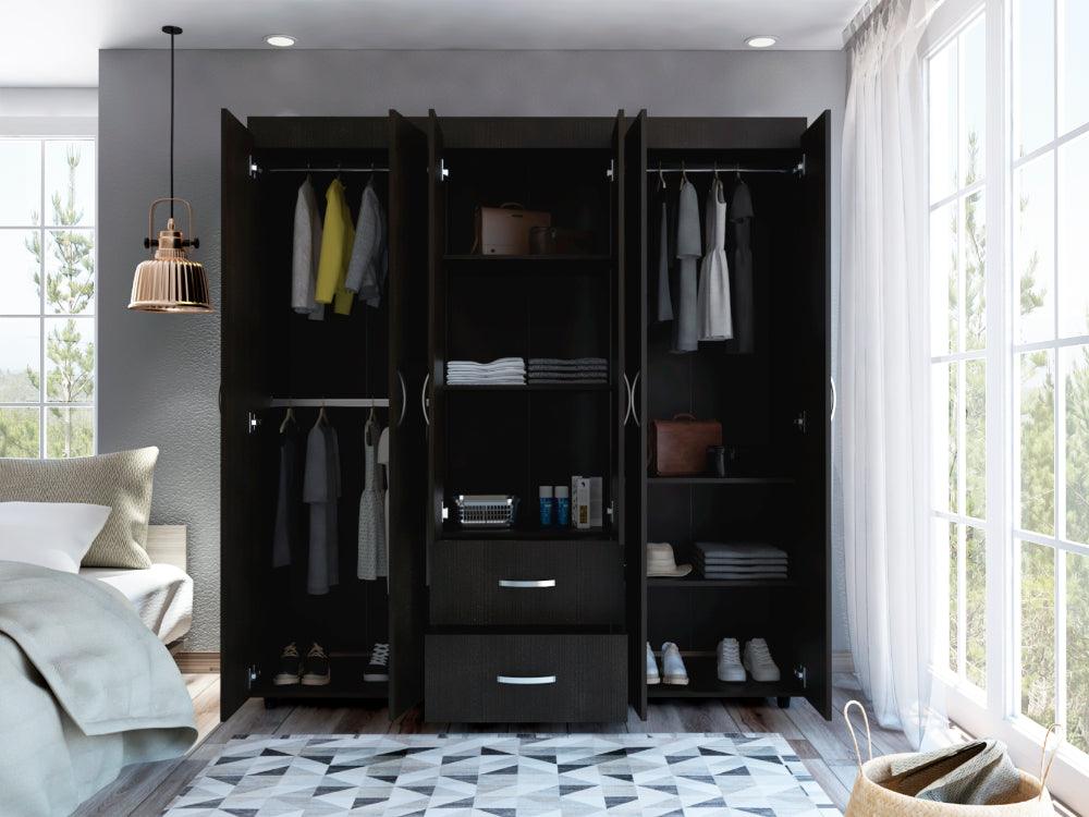 Closet, con amplios espacios y entrepaños para organizar, 6 puertas abatibles, 3 tubos cromados, 2 cajones organizadores, y deslizadores de plástico para apoyo al piso.
