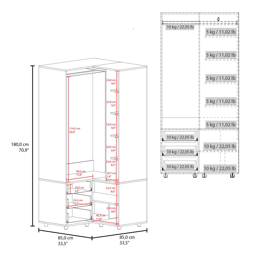 Closet esquinero con dos tubos cromados para colgar ropa, tres cajones, múltiples espacios de almacenamiento.