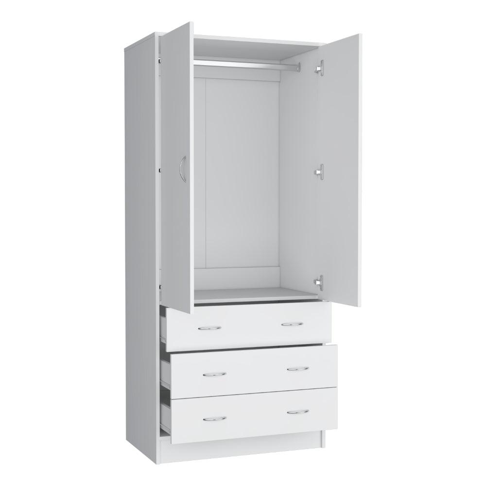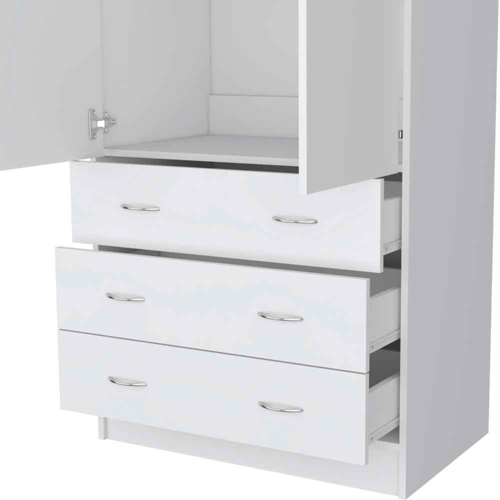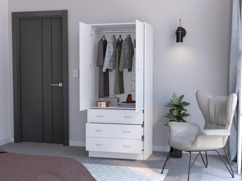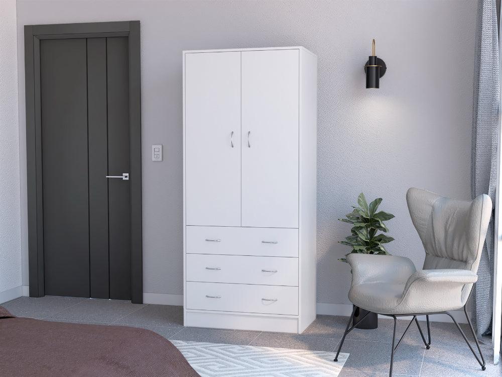 Closet, debe ser anclado a la pared, incluye los elementos para hacerlo, espacio para colgar ropa, cajones con gran capacidad de almacenamiento.