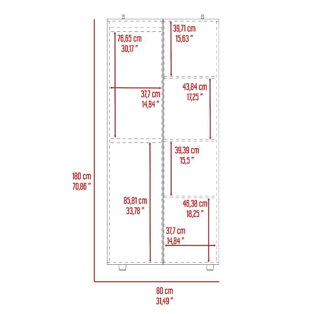 Closet, con dos puertas batientes, dos tubos cromados para colgar prendas, tres entrepaños para organizar, manijas negras.