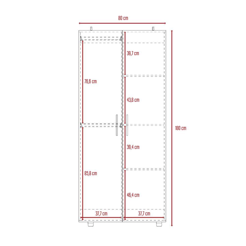 Closet, con dos puertas batientes, dos tubos cromados para colgar prendas, tres entrepaños para organizar, manijas negras.