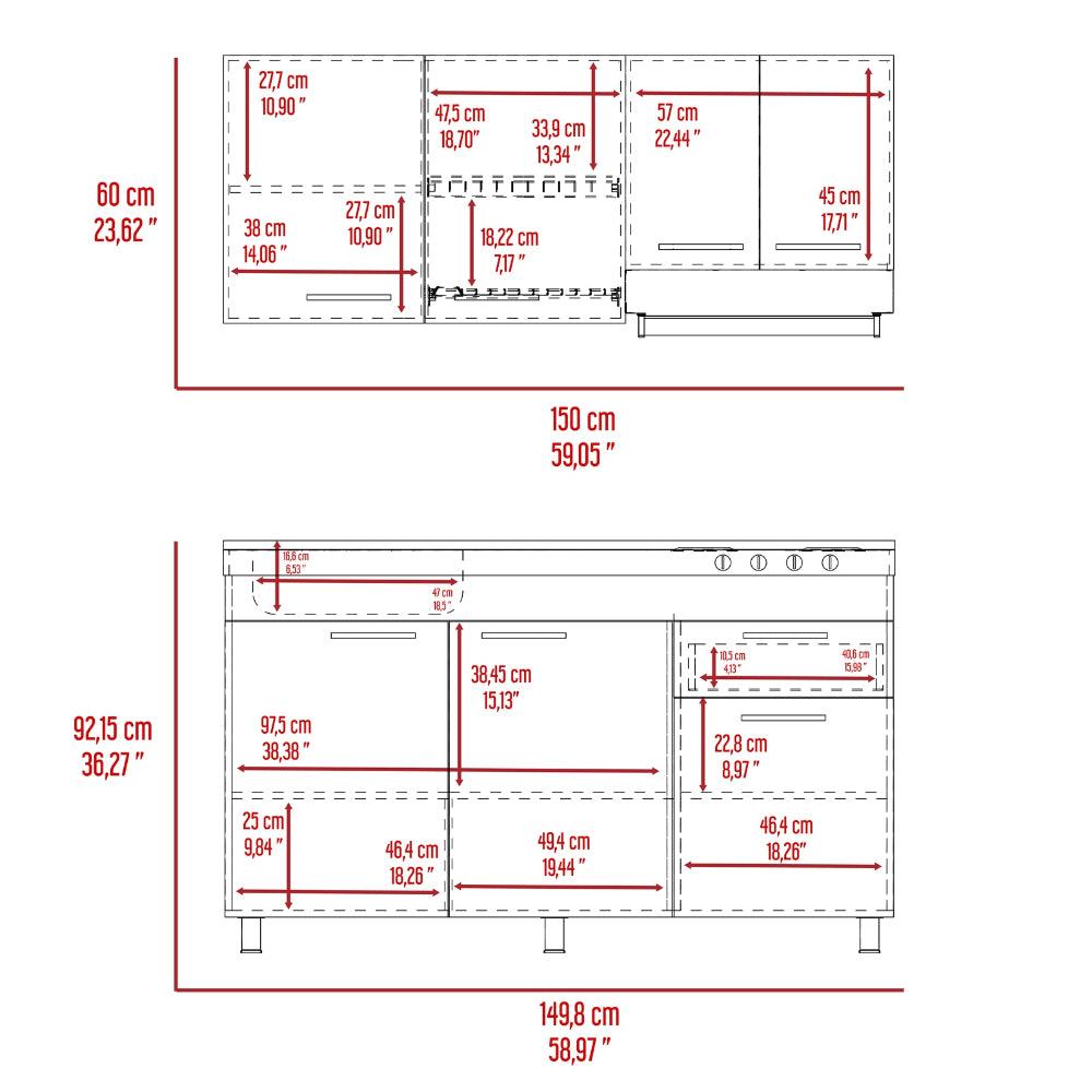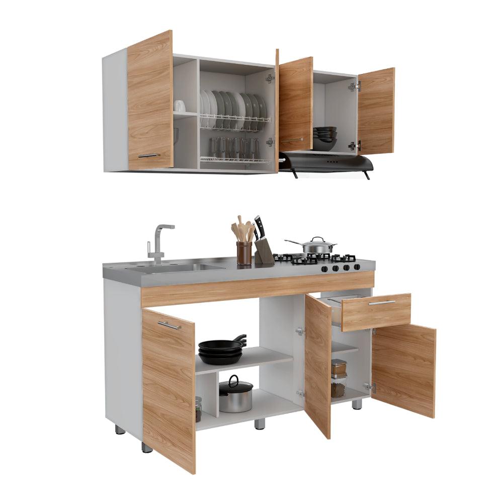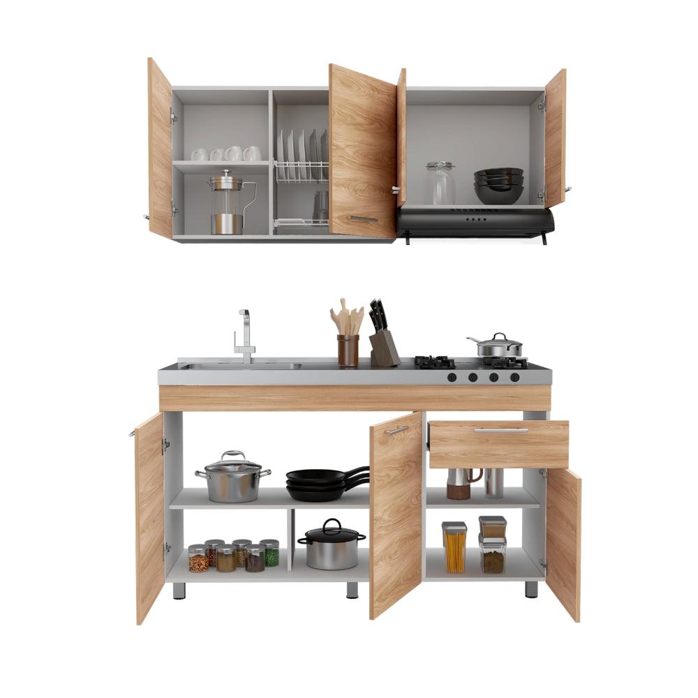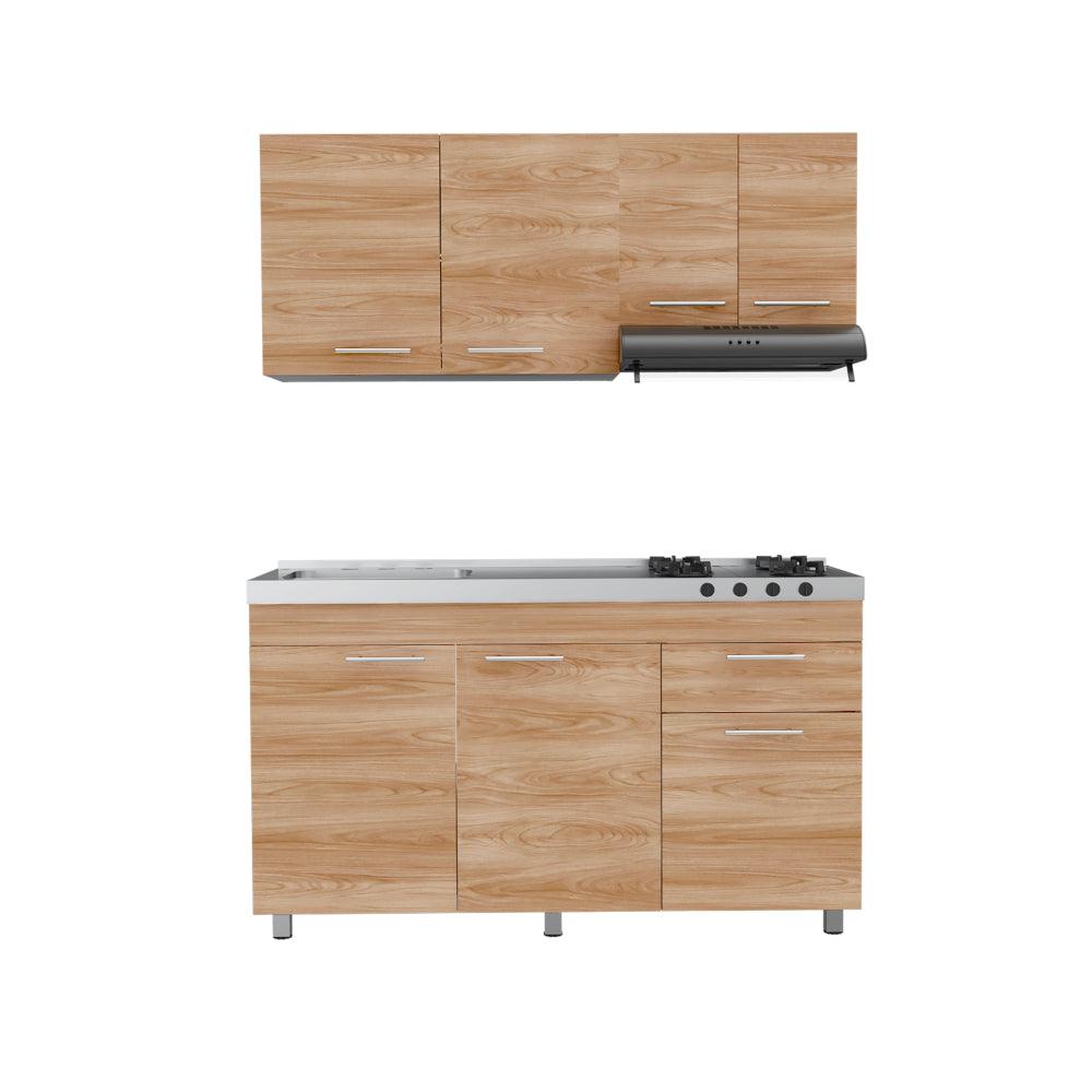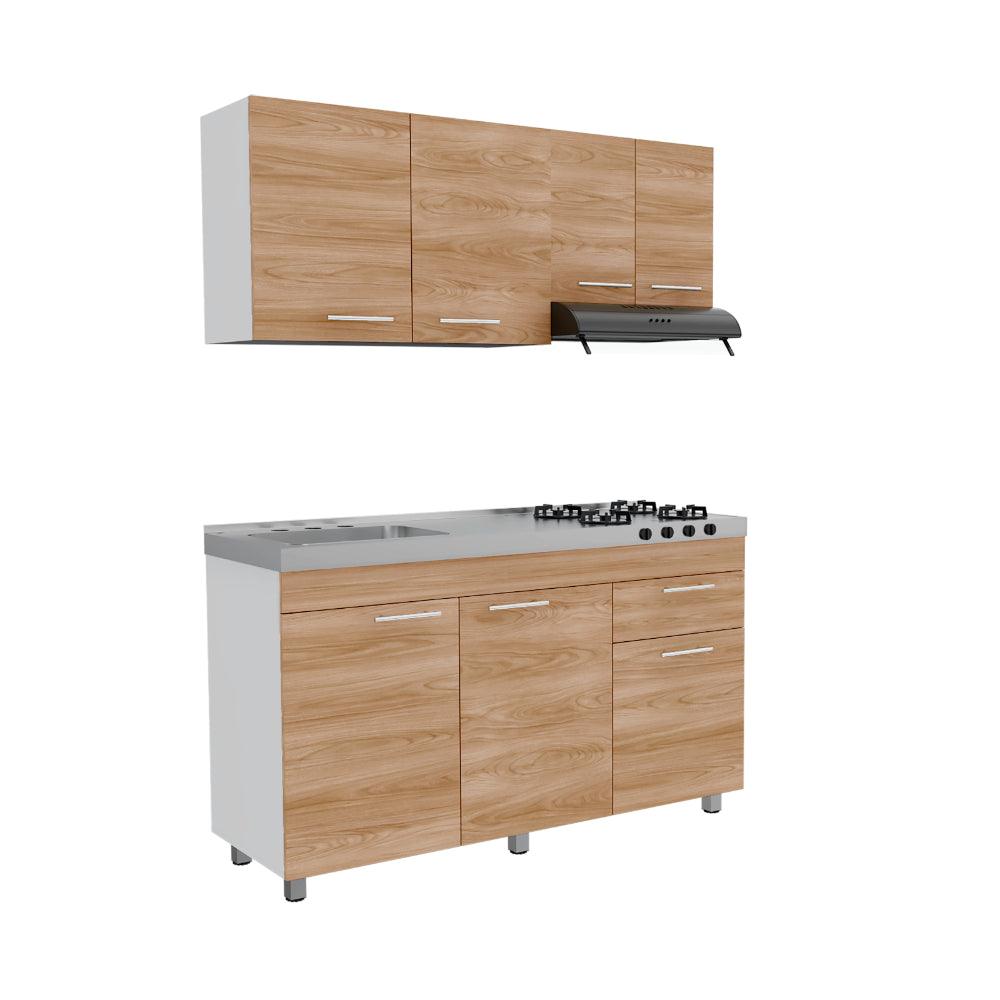 Cocina Integral, con mueble superior con cuatro puertas batientes, incluye locero y portavasos, manijas metálicas, incluye campana extractora medidas de alto 60 ancho 150 fondo 33, mueble inferior con tres puertas batientes, un cajón, patas metálicas, incluye mesón izquierdo medidas de alto 90 ancho 150 fondo 50