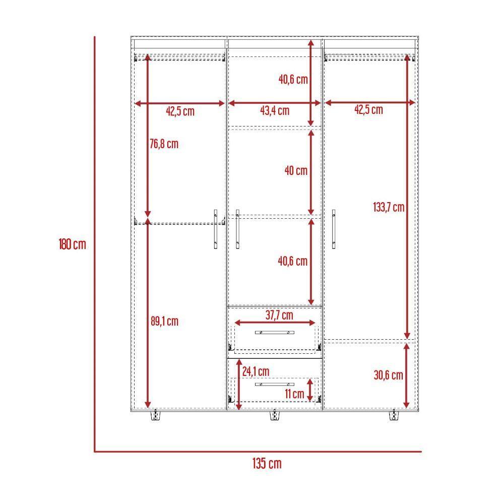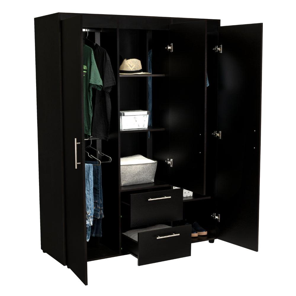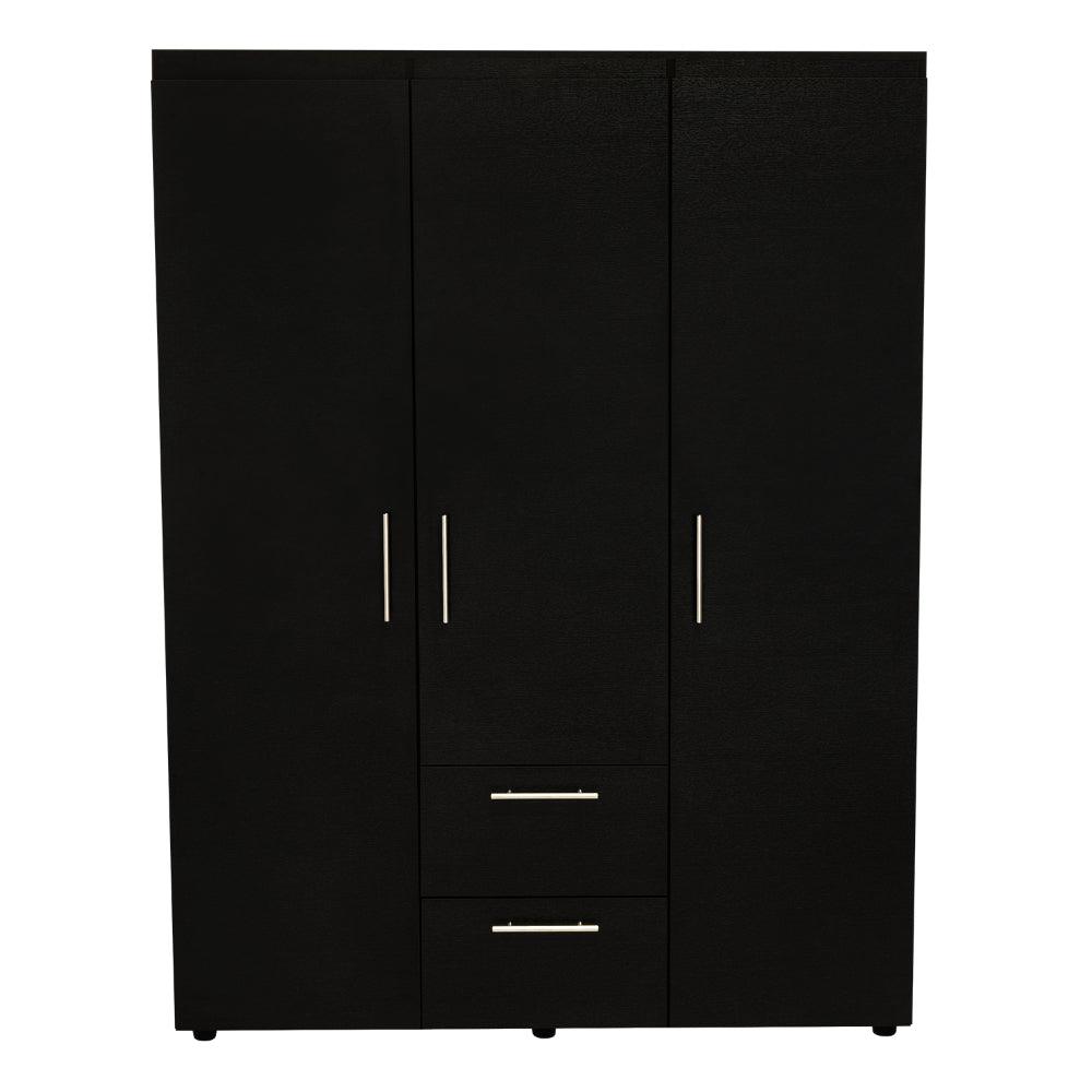 Closet, con varios entrepaños, 2 cajones deslizables, 3 tubos cromados, 3 puertas batientes y manijas. Color Wengue