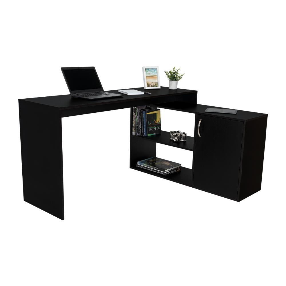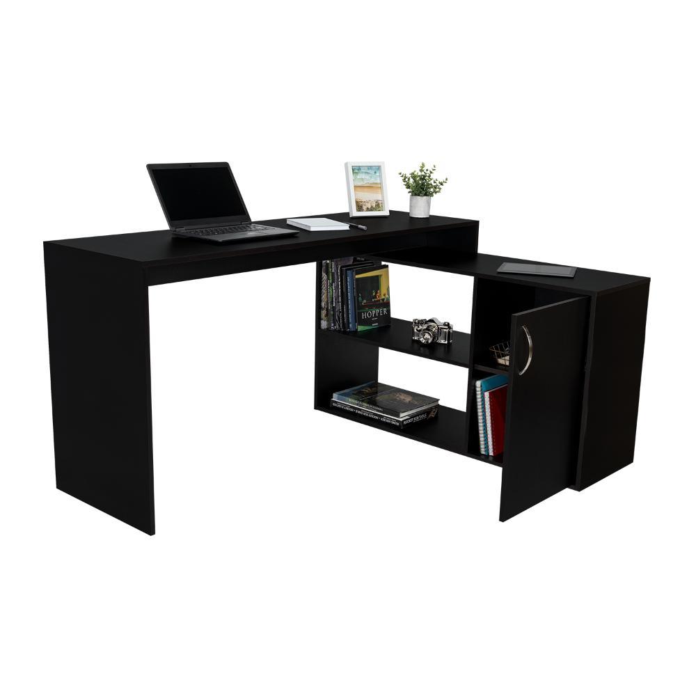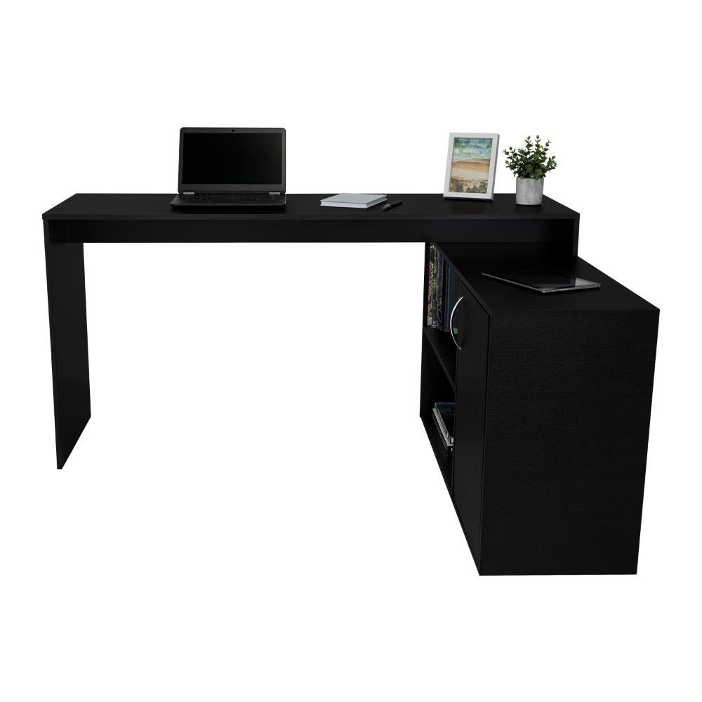 Escritorio en L, cuenta con amplia superficie de trabajo y el eje de lateral tiene amplios entrepaños para ubicar libros u otros elementos de trabajo y estudio, y un práctico espacio con puerta para almacenar múltiples objetos. Ideal para el hogar o la oficina, incluye manual para ensamble. Color Wengue