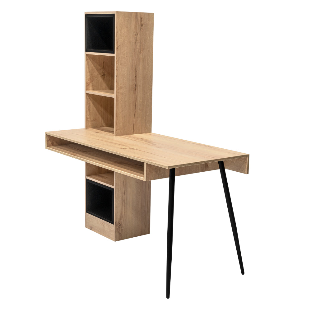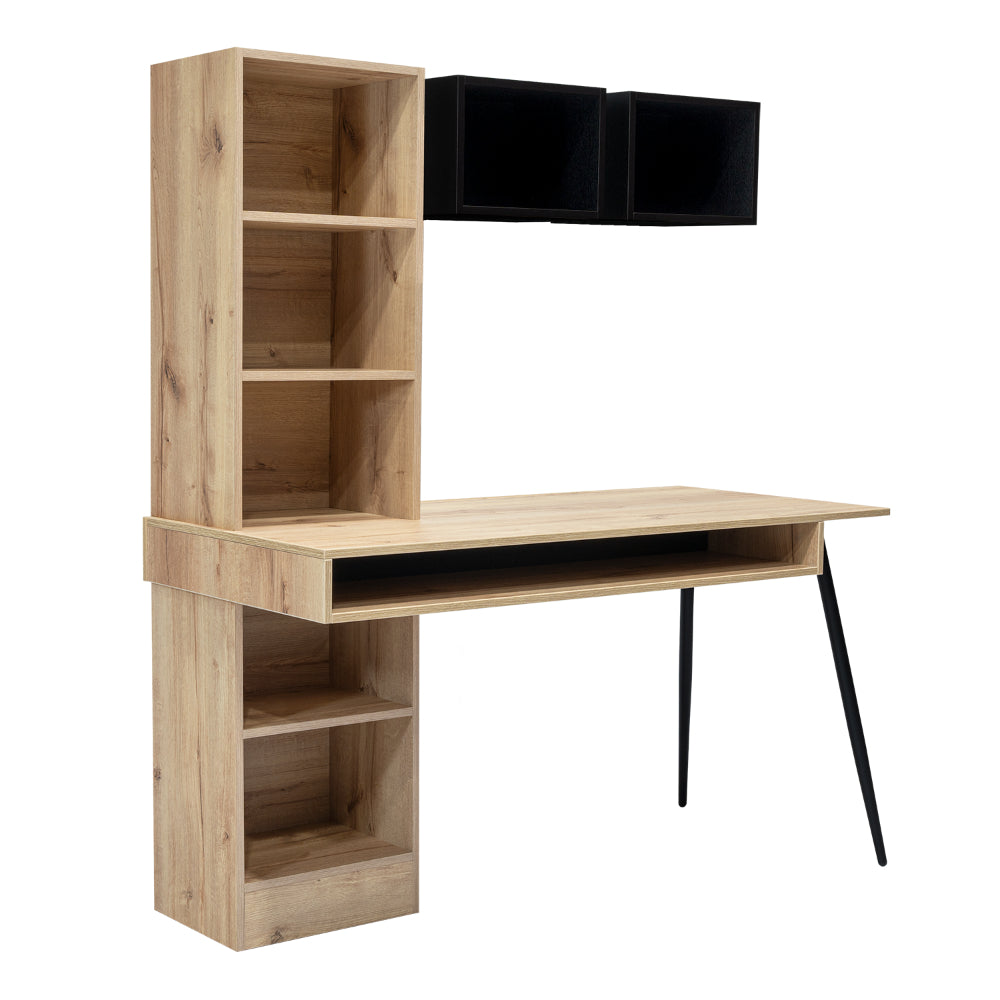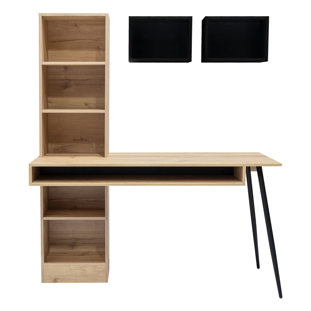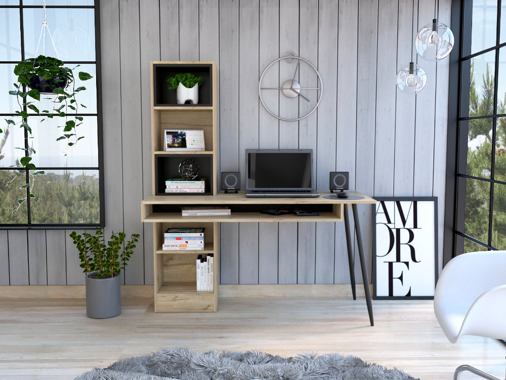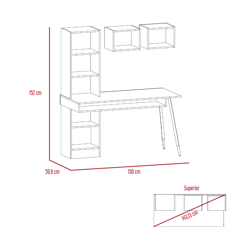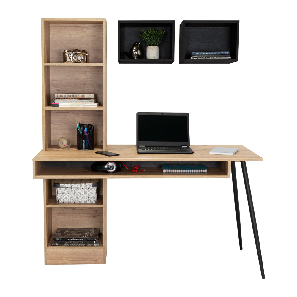 Escritorio, con diseño diseño moderno, amplia superficie de trabajo, módulos para colgar en la pared, y patas metálicas.