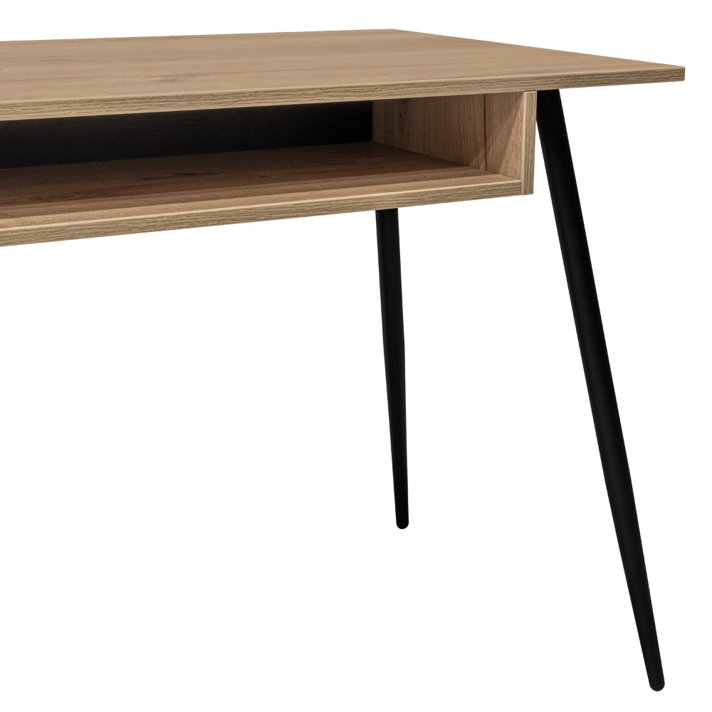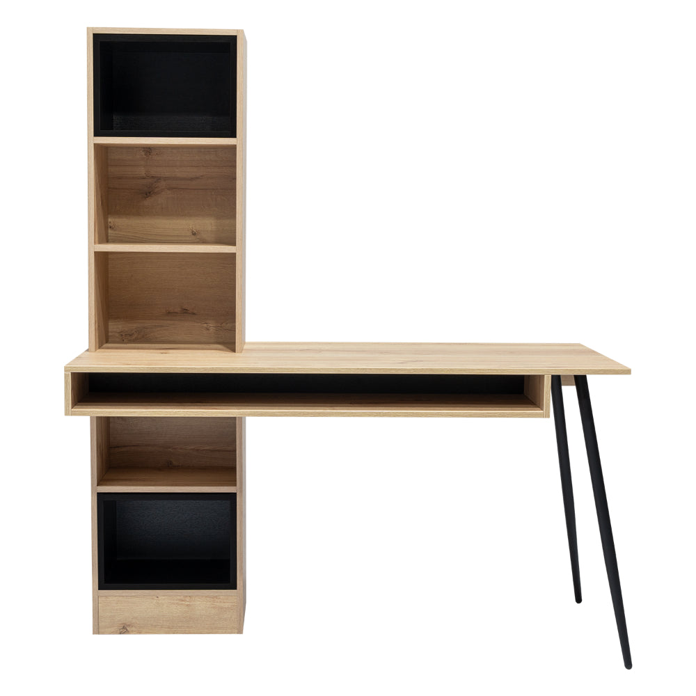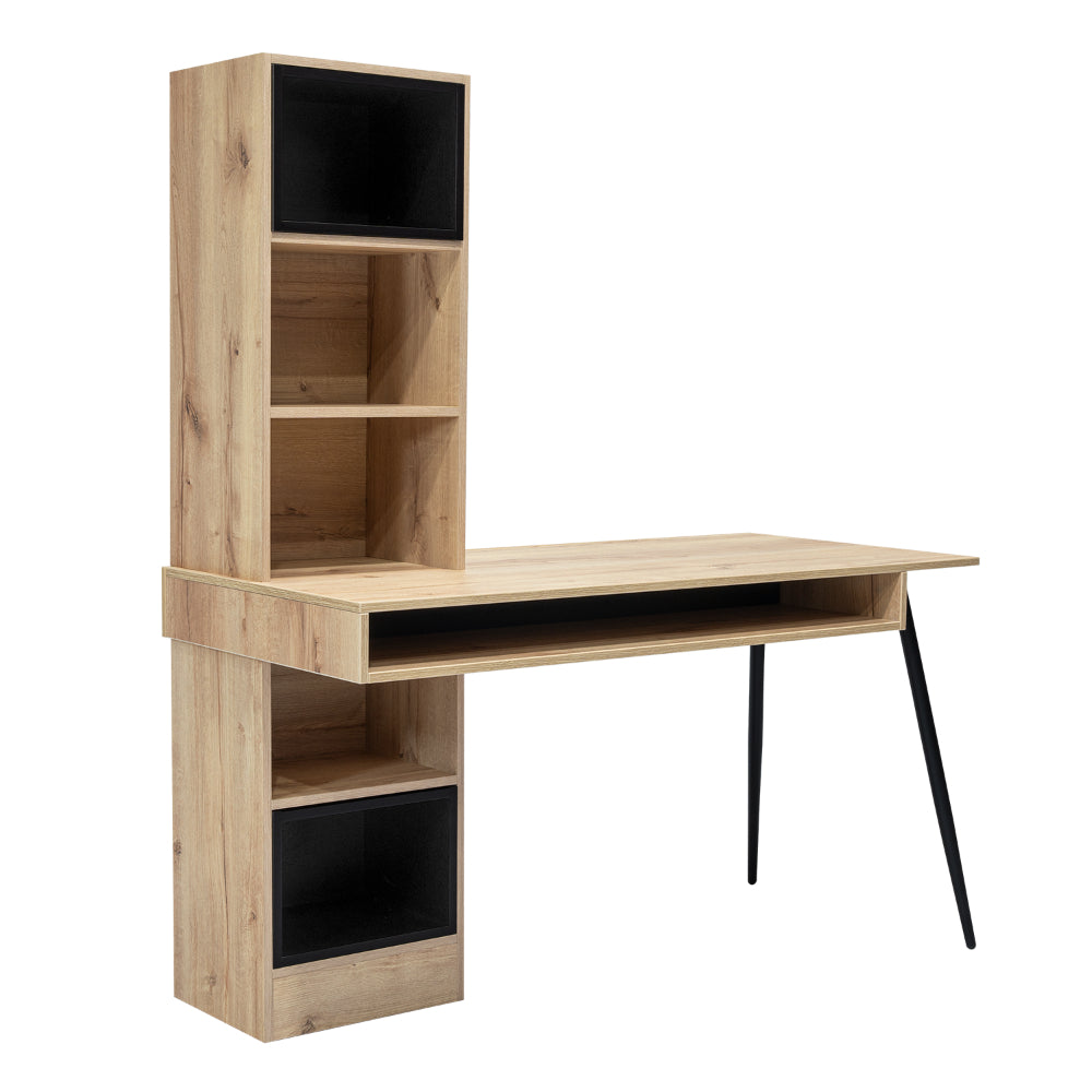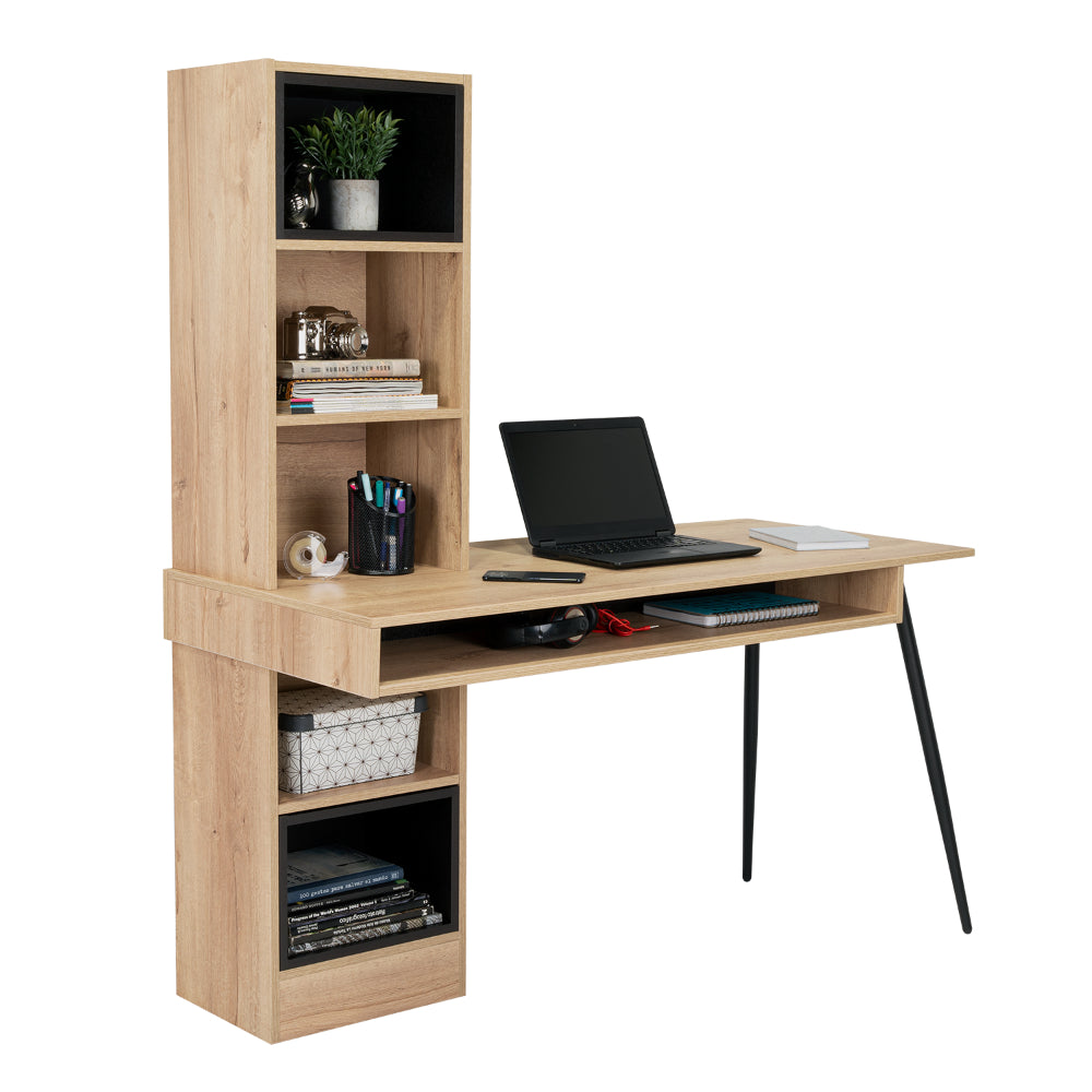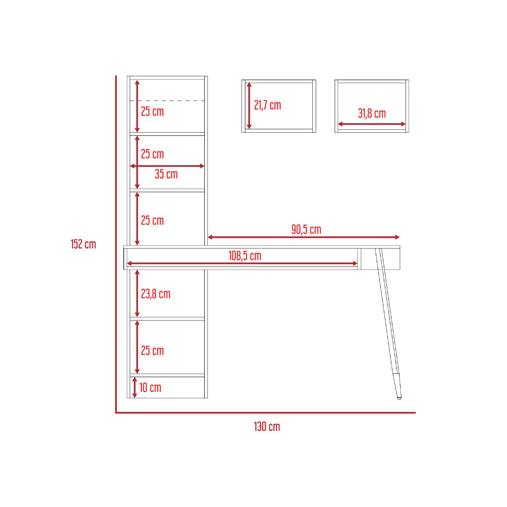 Escritorio, con diseño diseño moderno, amplia superficie de trabajo, módulos para colgar en la pared, y patas metálicas.