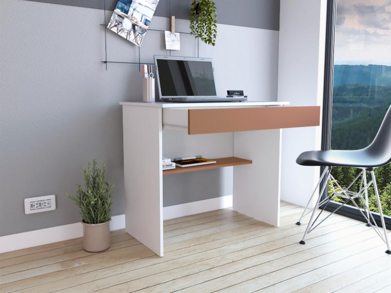 Escritorio con diseño moderno, amplia superficie de trabajo, entrepaño y cajon.