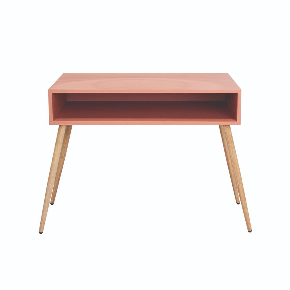 Escritorio con patas en madera clara diagonal y mesa en color Arupo, contiene tarugos y requiere armado.
