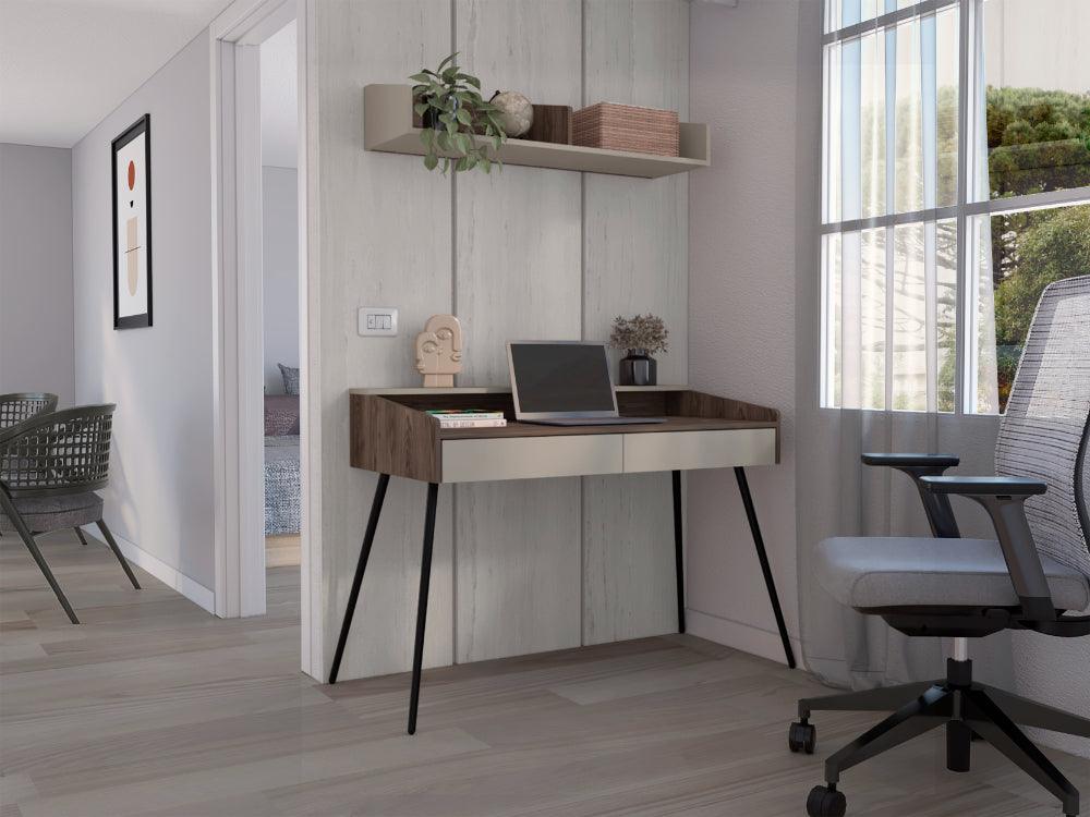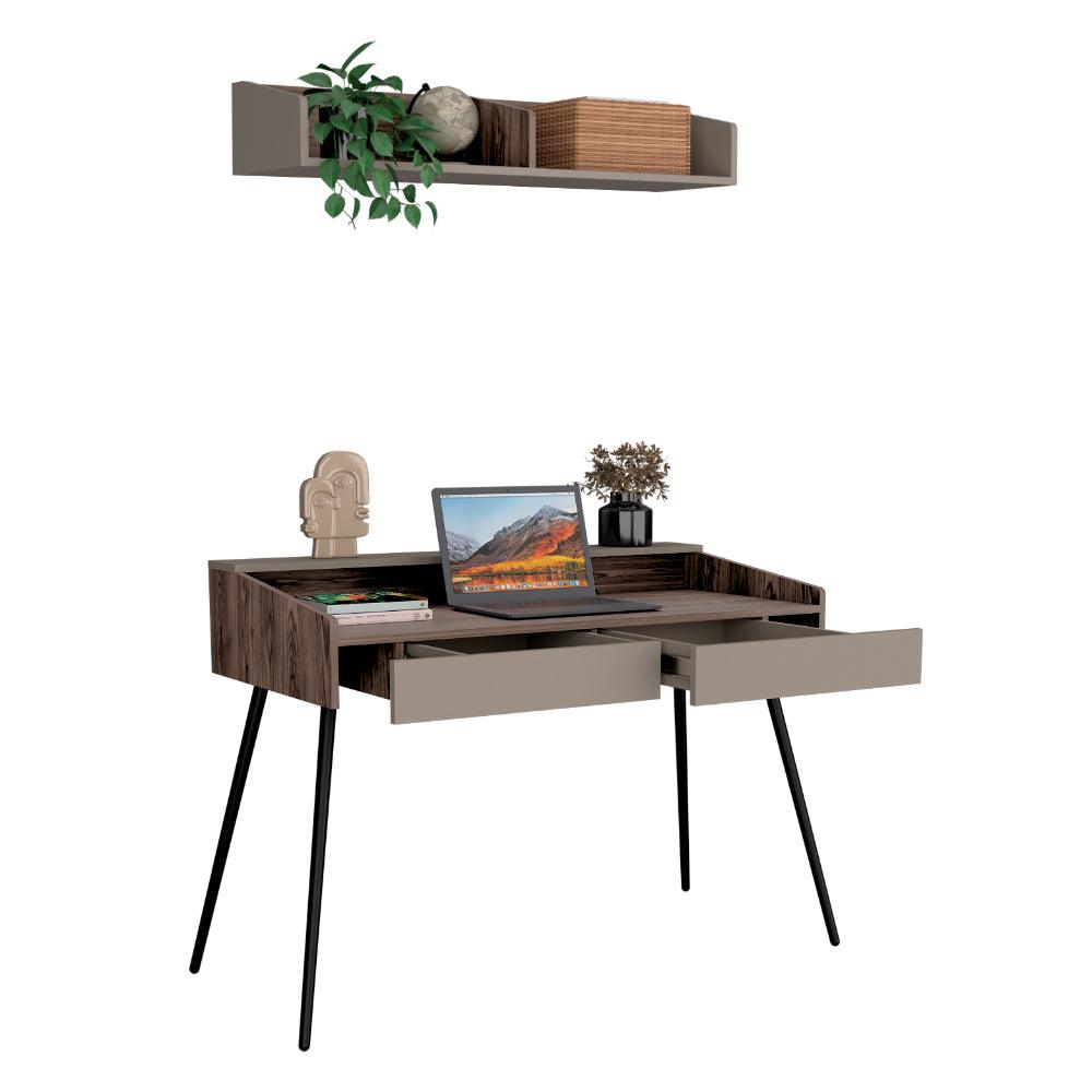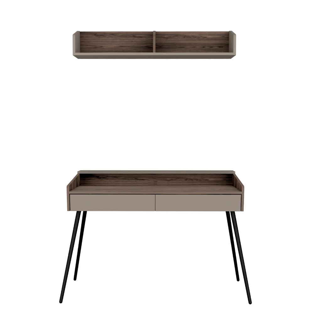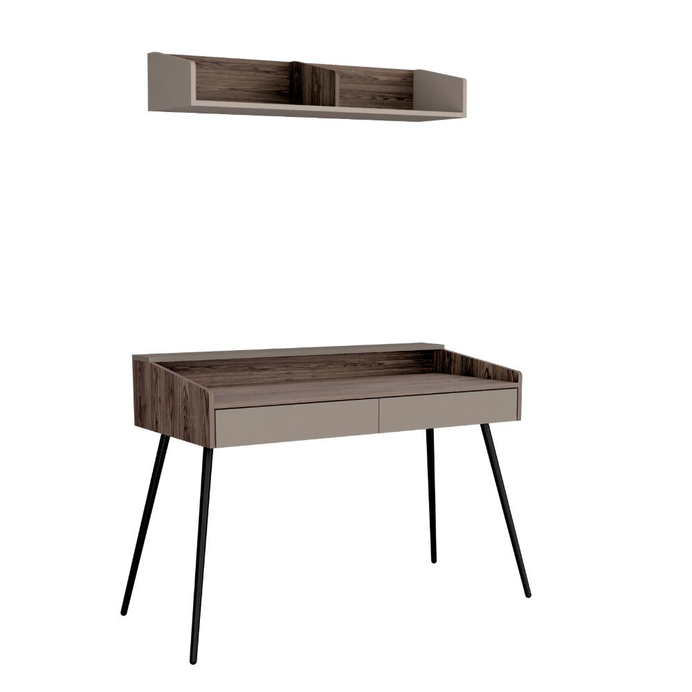 Escritorio Madi, Chocolate y Cocoa, con patas metálicas y repisa