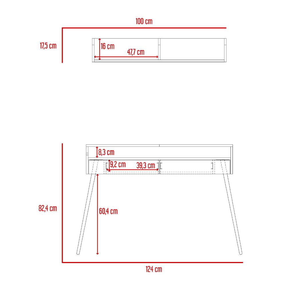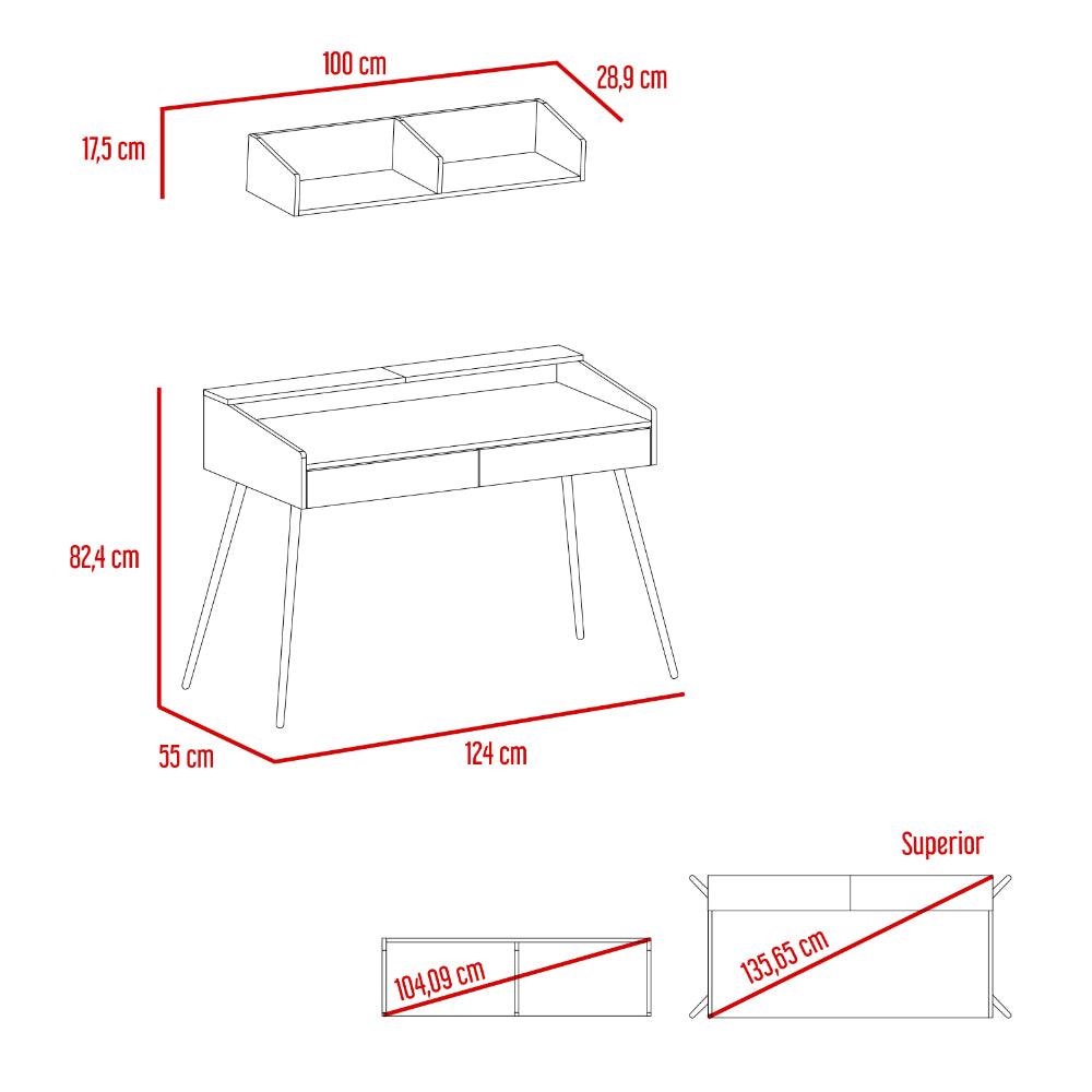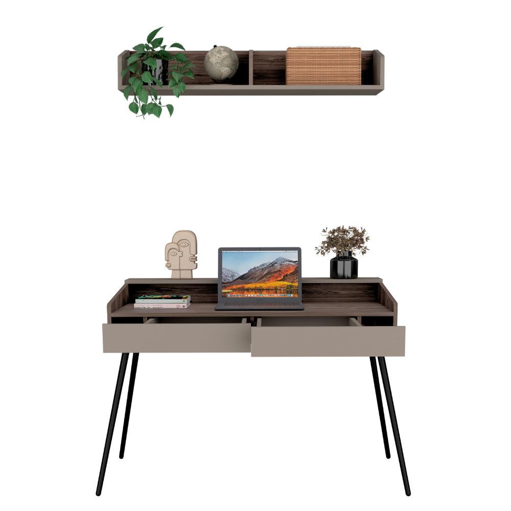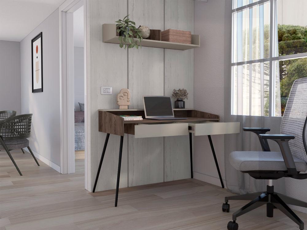 Escritorio Madi, Chocolate y Cocoa, con patas metálicas y repisa
