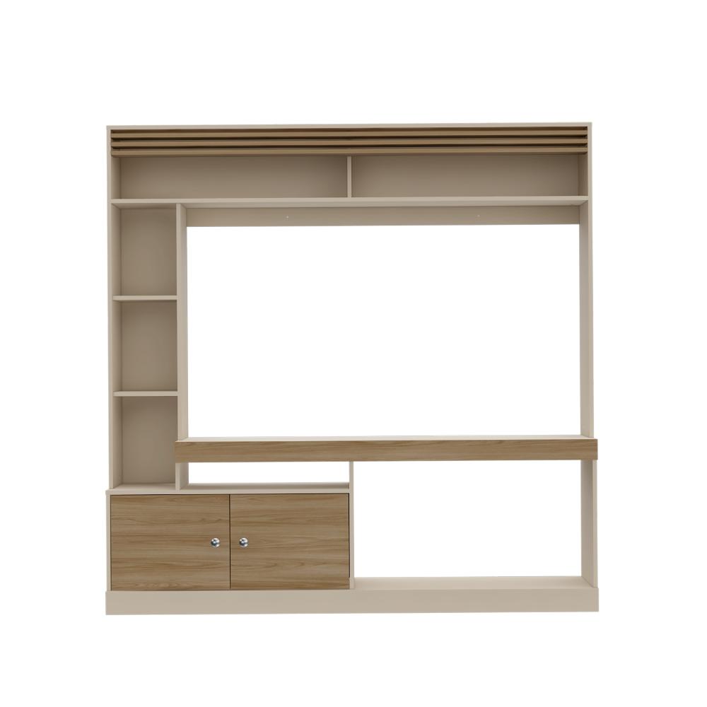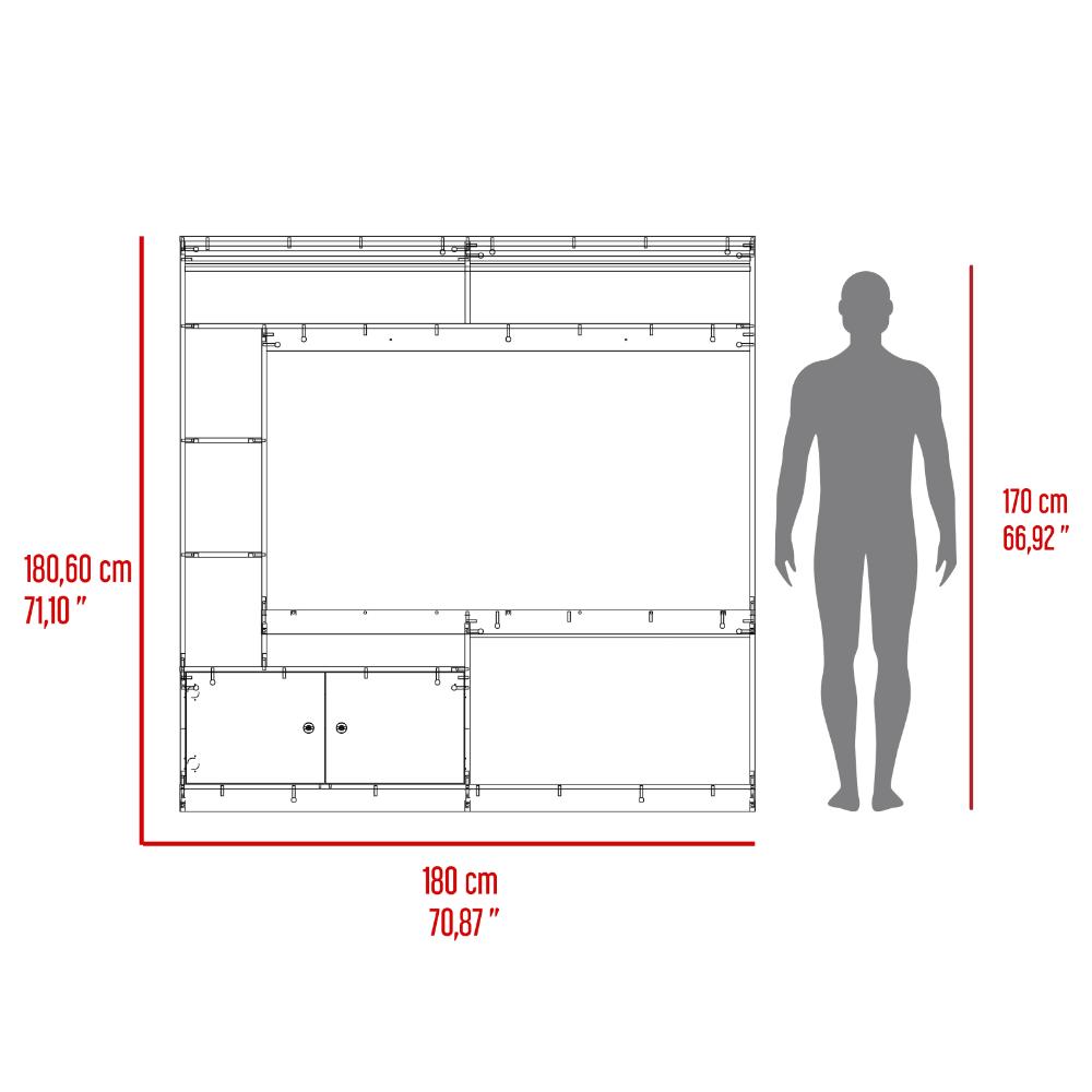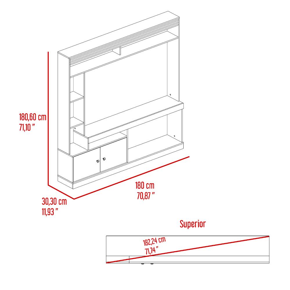 Mesa para TV, con 2 puertas abatibles, espacio para ubicar Tv de hasta 55", espacio para ubicar equipos de audio y video, manijas metálicas tipo botón y, amplios espacios para ubicar objetos decorativos.