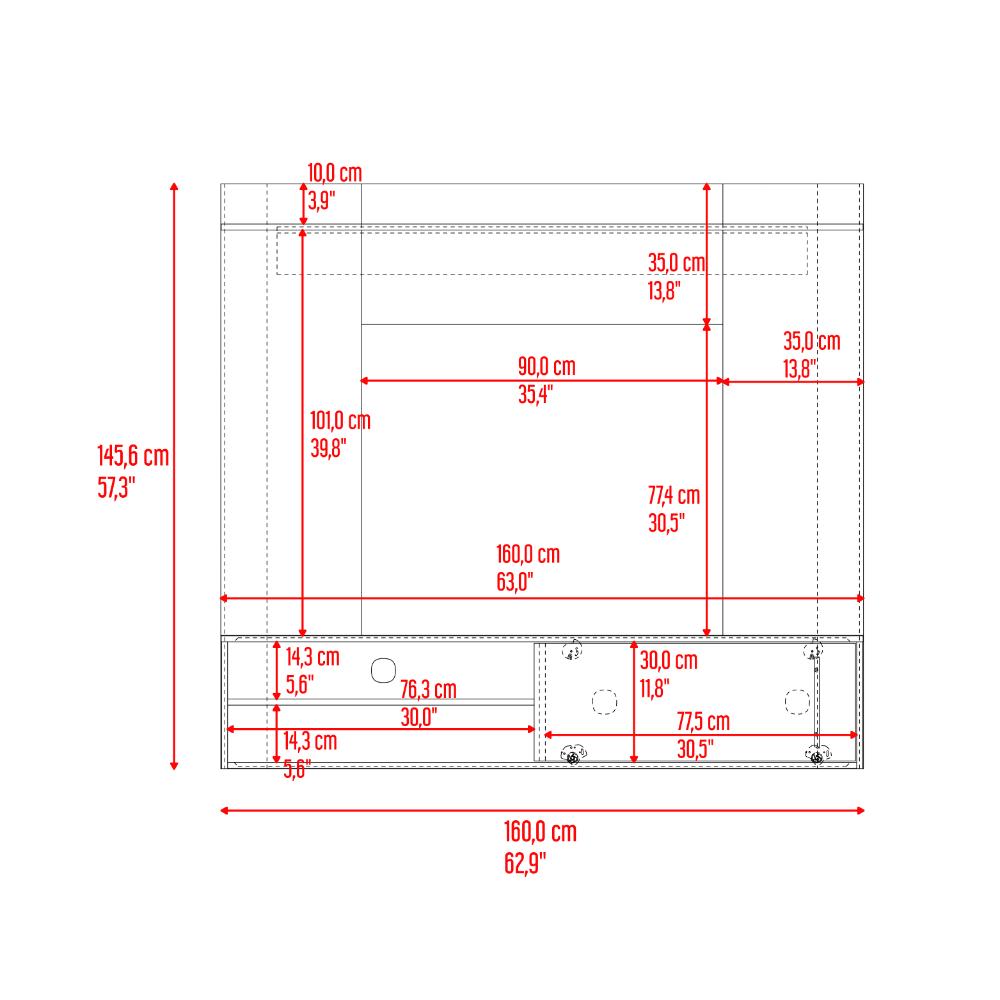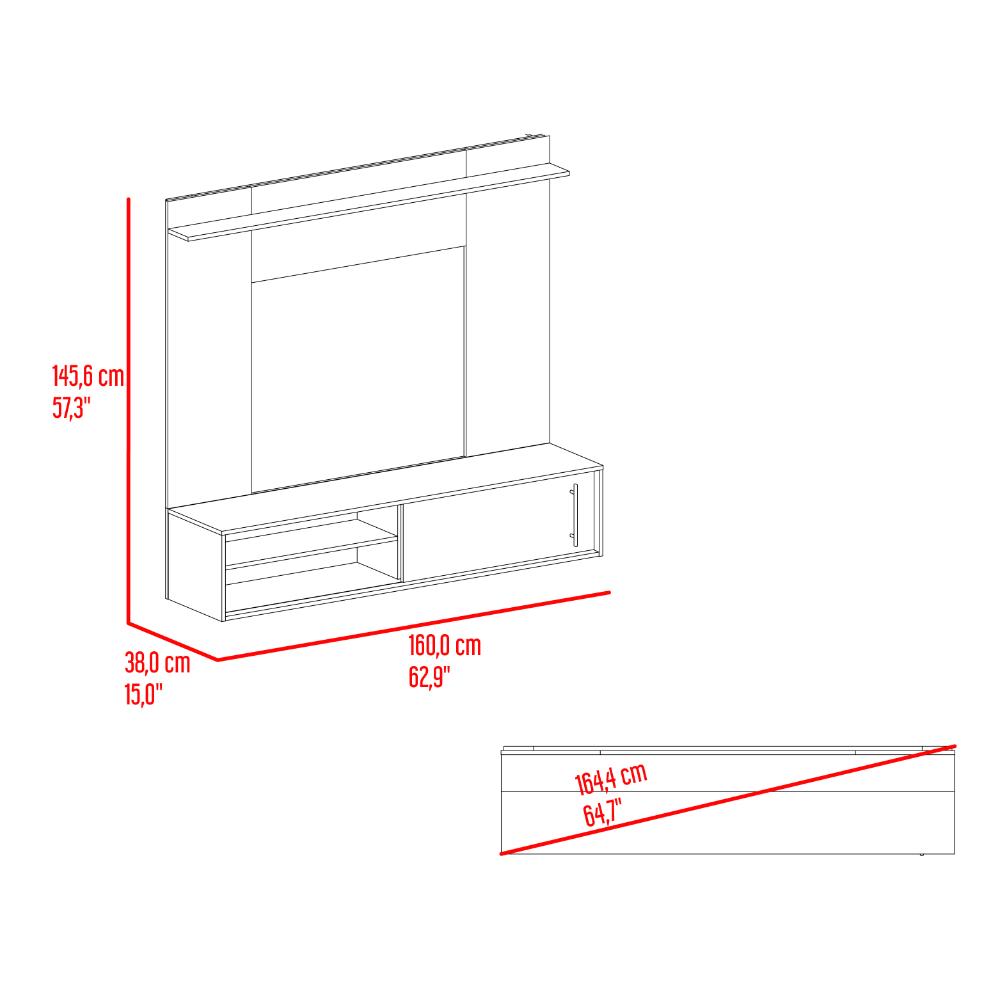 Panel para TV de 60" con una puerta corrediza y con espacio para colocar objetos decorativos, equipo de audio y video.