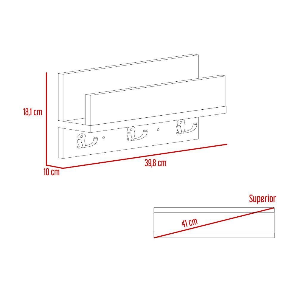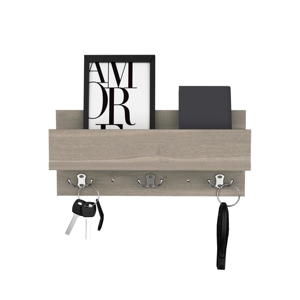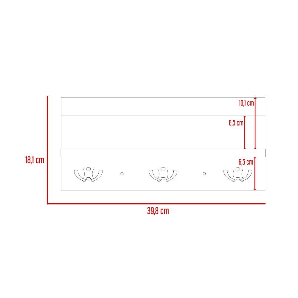 Repisa con 3 ganchos para colgar llaves o accerios y poner el celular; no requiere armado, incluye chazos para instalación a pared.