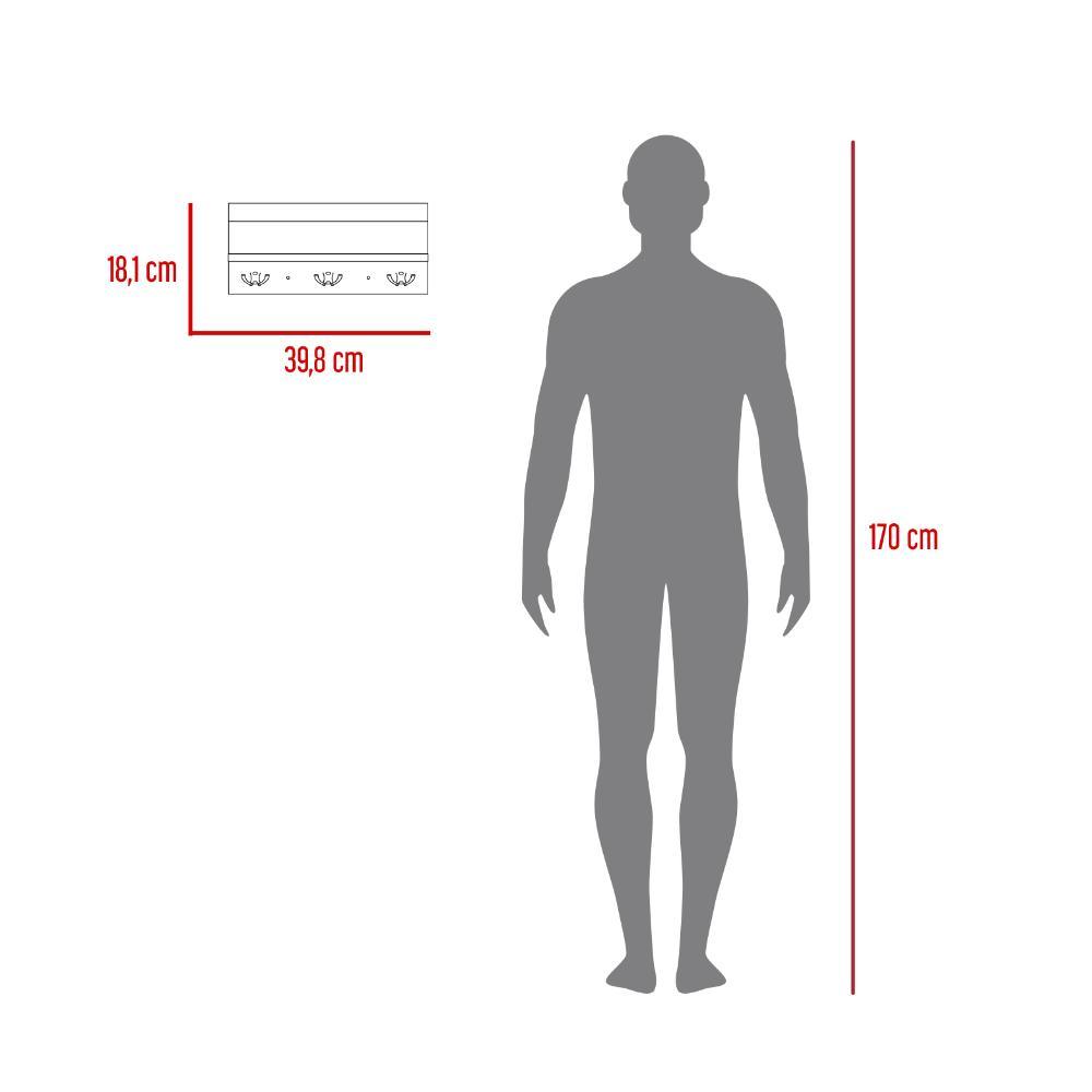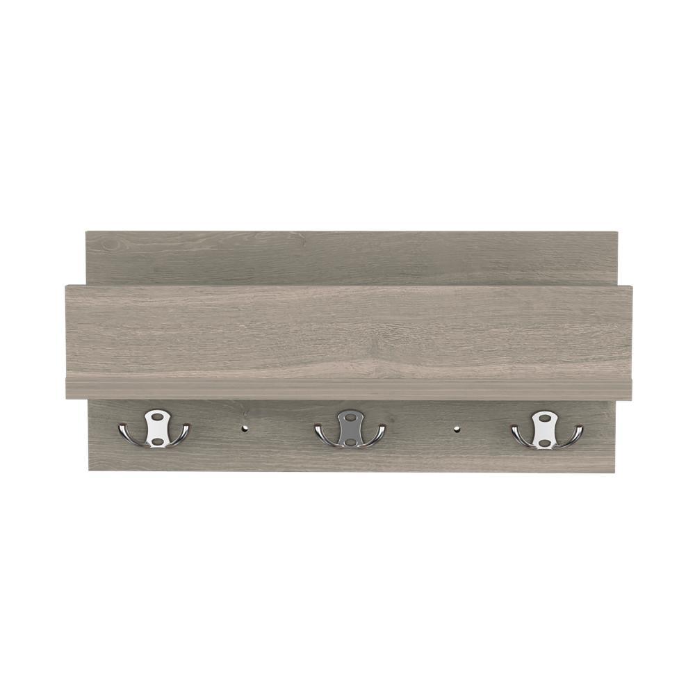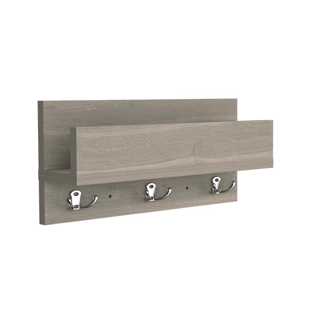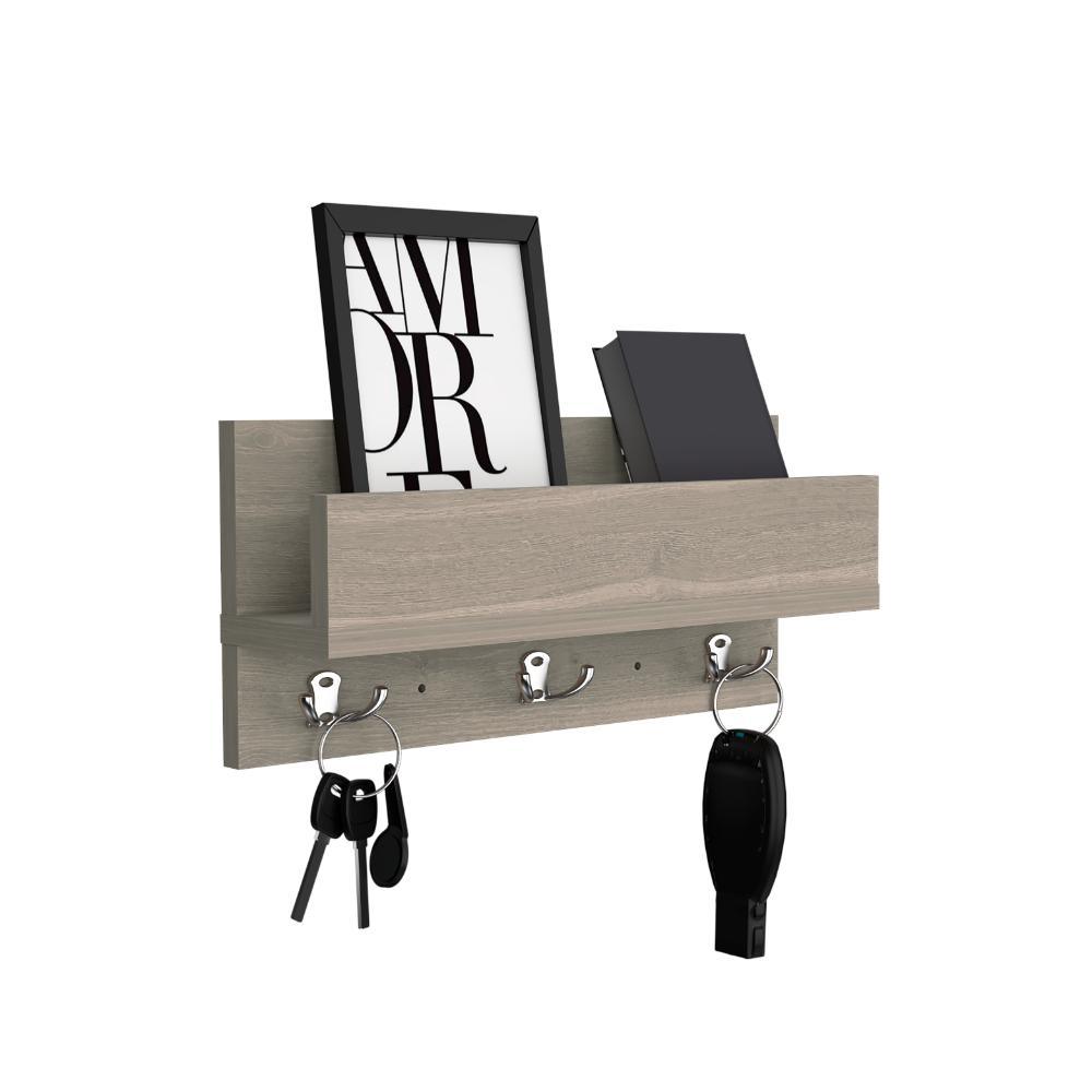 Repisa con 3 ganchos para colgar llaves o accerios y poner el celular; no requiere armado, incluye chazos para instalación a pared.