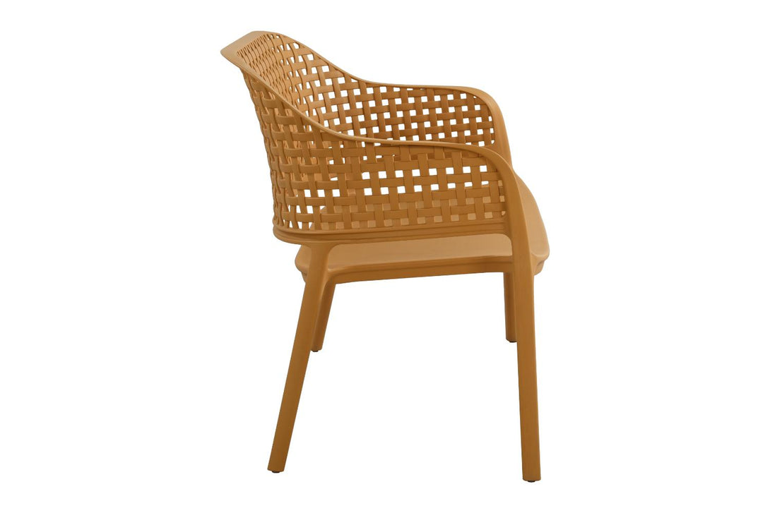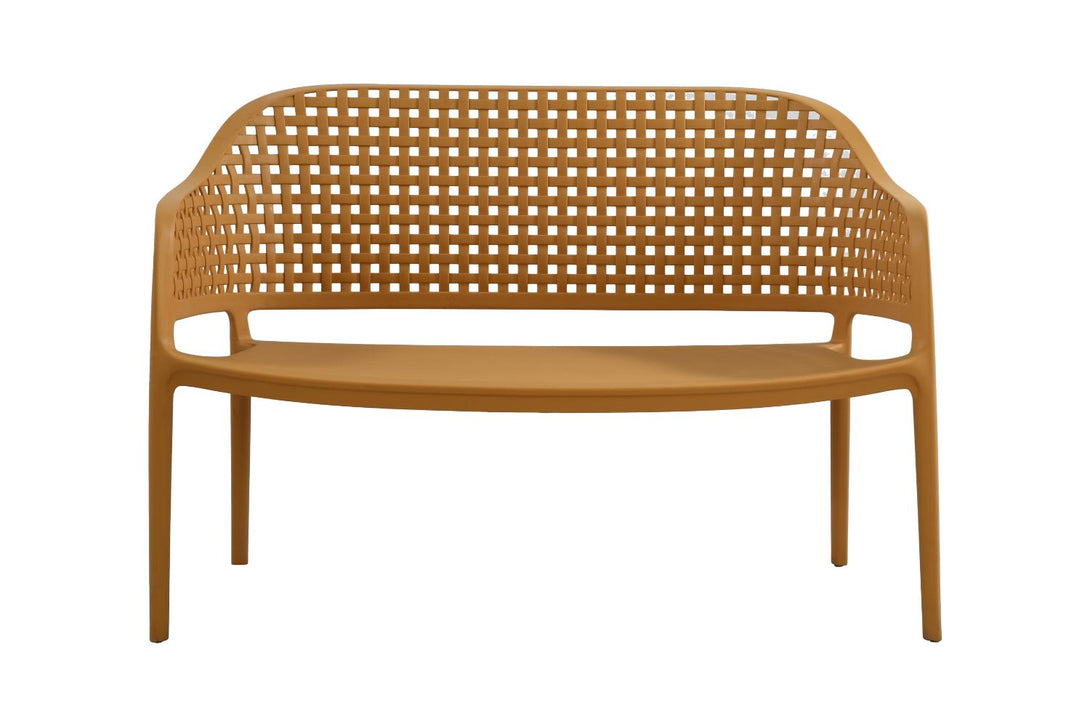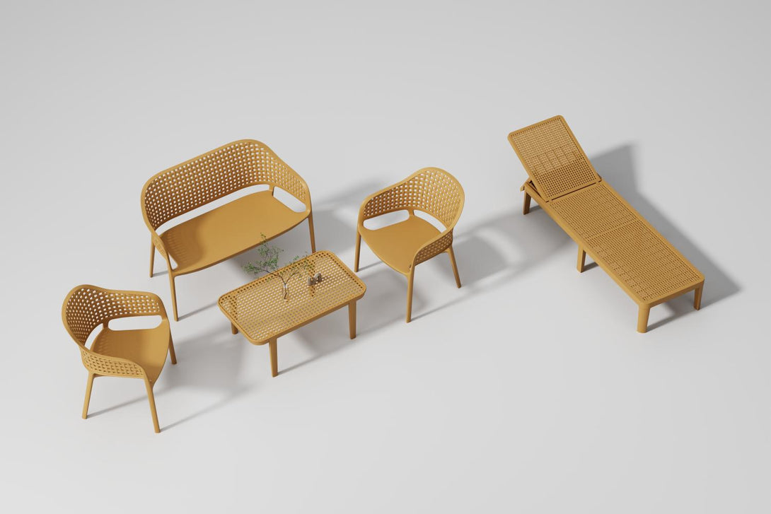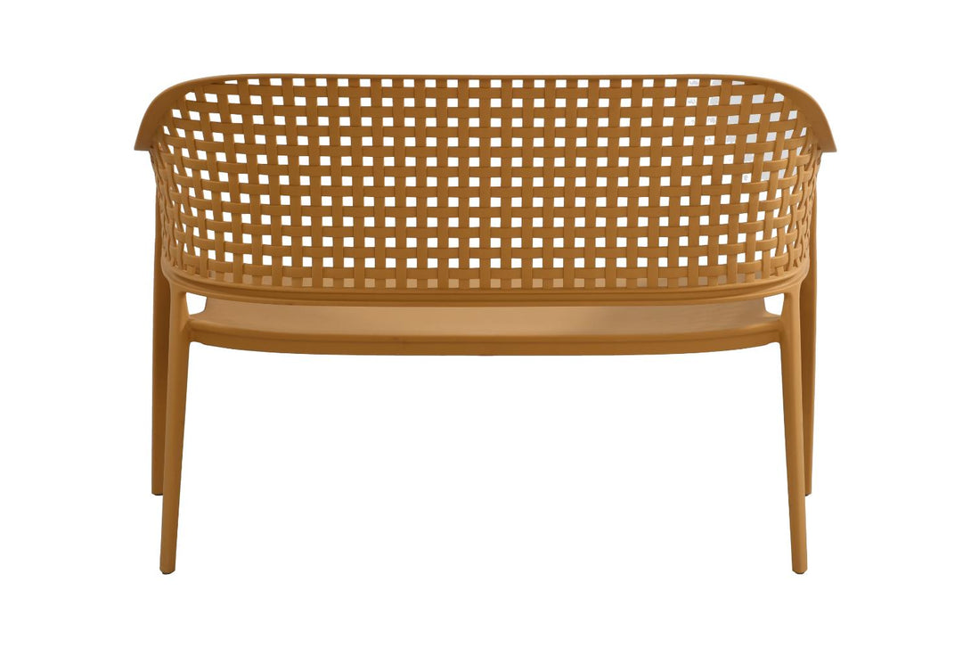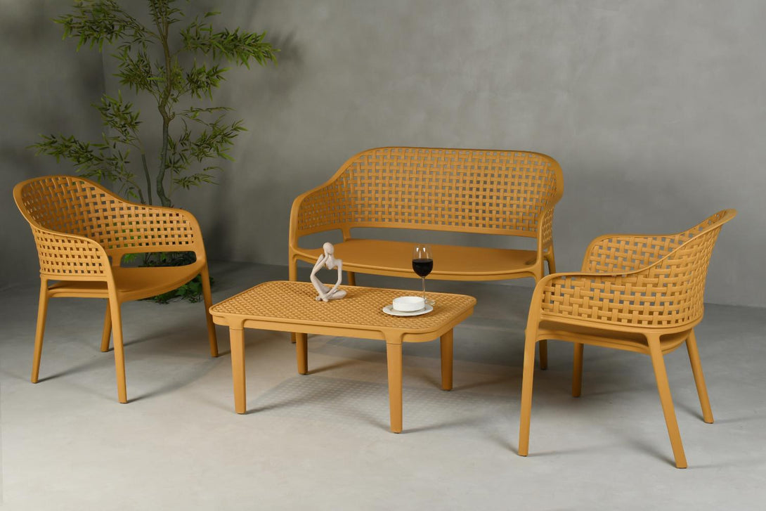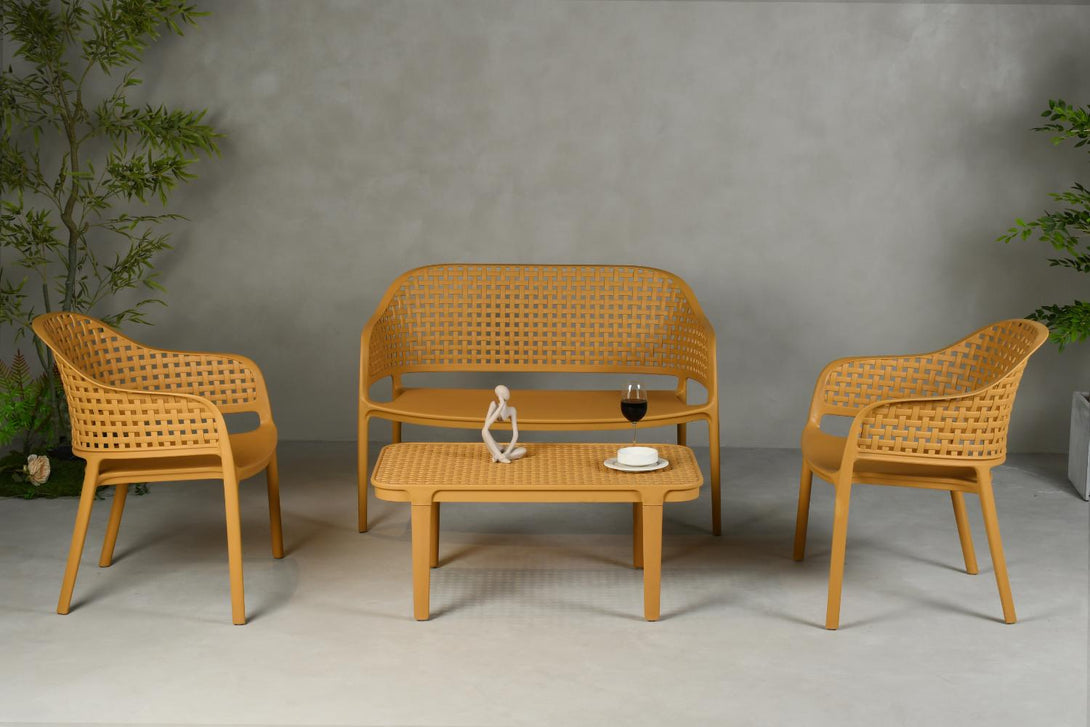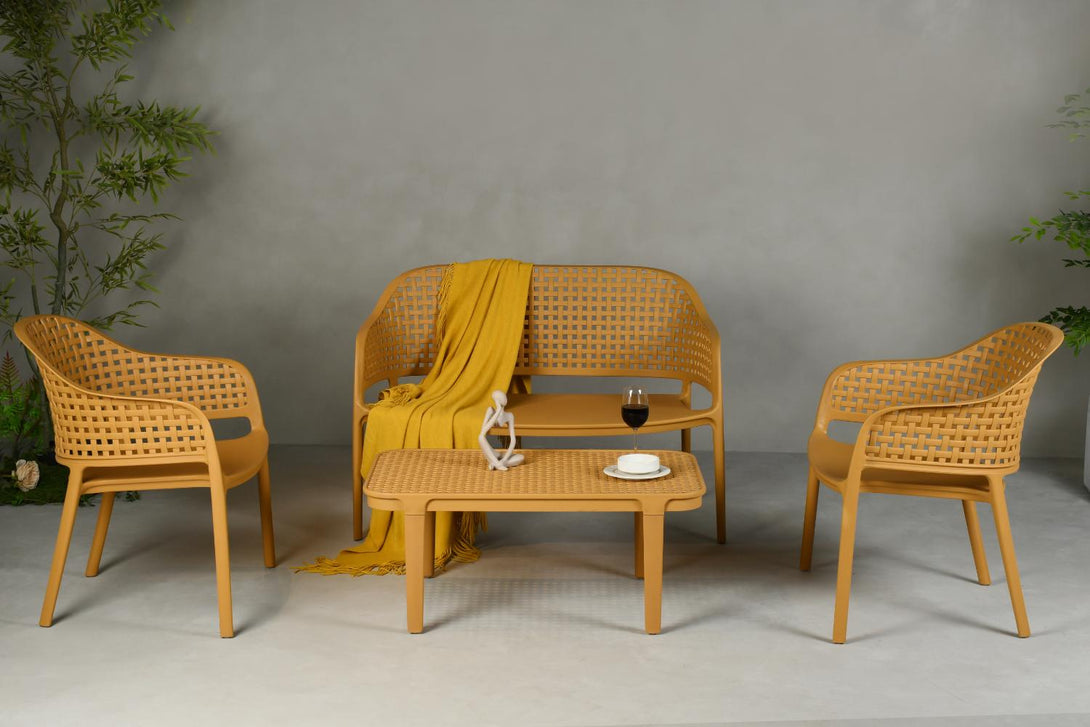 Elaborado en Polipropileno y protección a los rayos UV el set incluye mesa centro, dos sillas y un banco, en Color Naraja