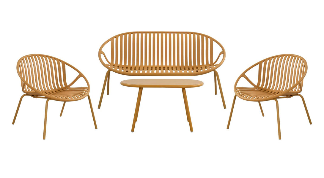 Elaborado en Polipropileno y protección a los rayos UV el set incluye mesa centro, dos sillas y un banco en patas metalicas, en Color Naranja